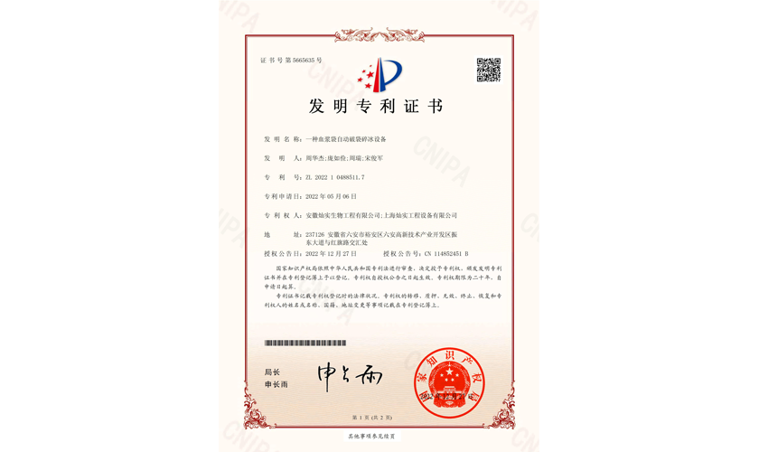 一種血漿袋自動破袋碎冰設備-發(fā)明專利證書