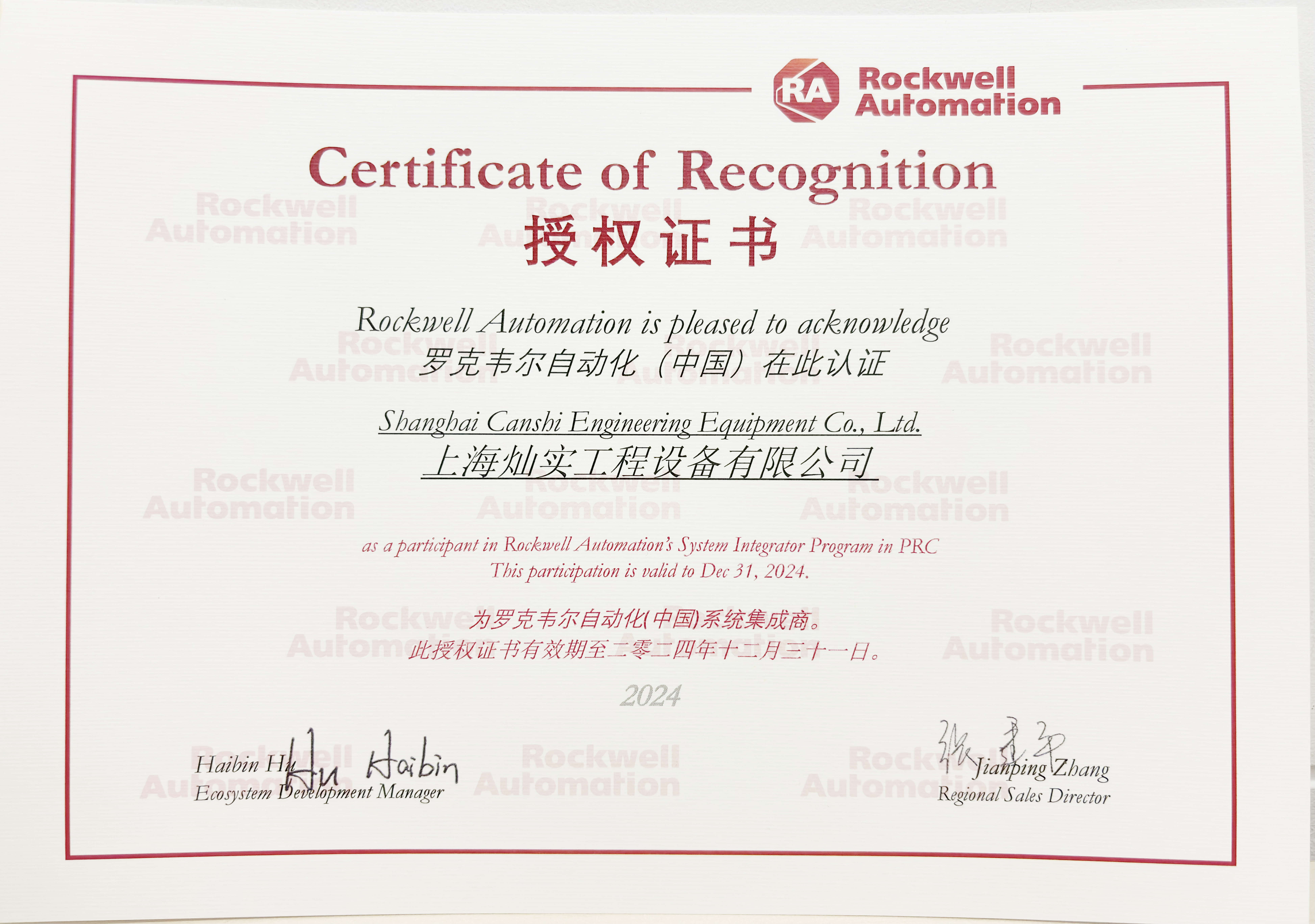 羅克韋爾自動化系統(tǒng)集成商授權證書